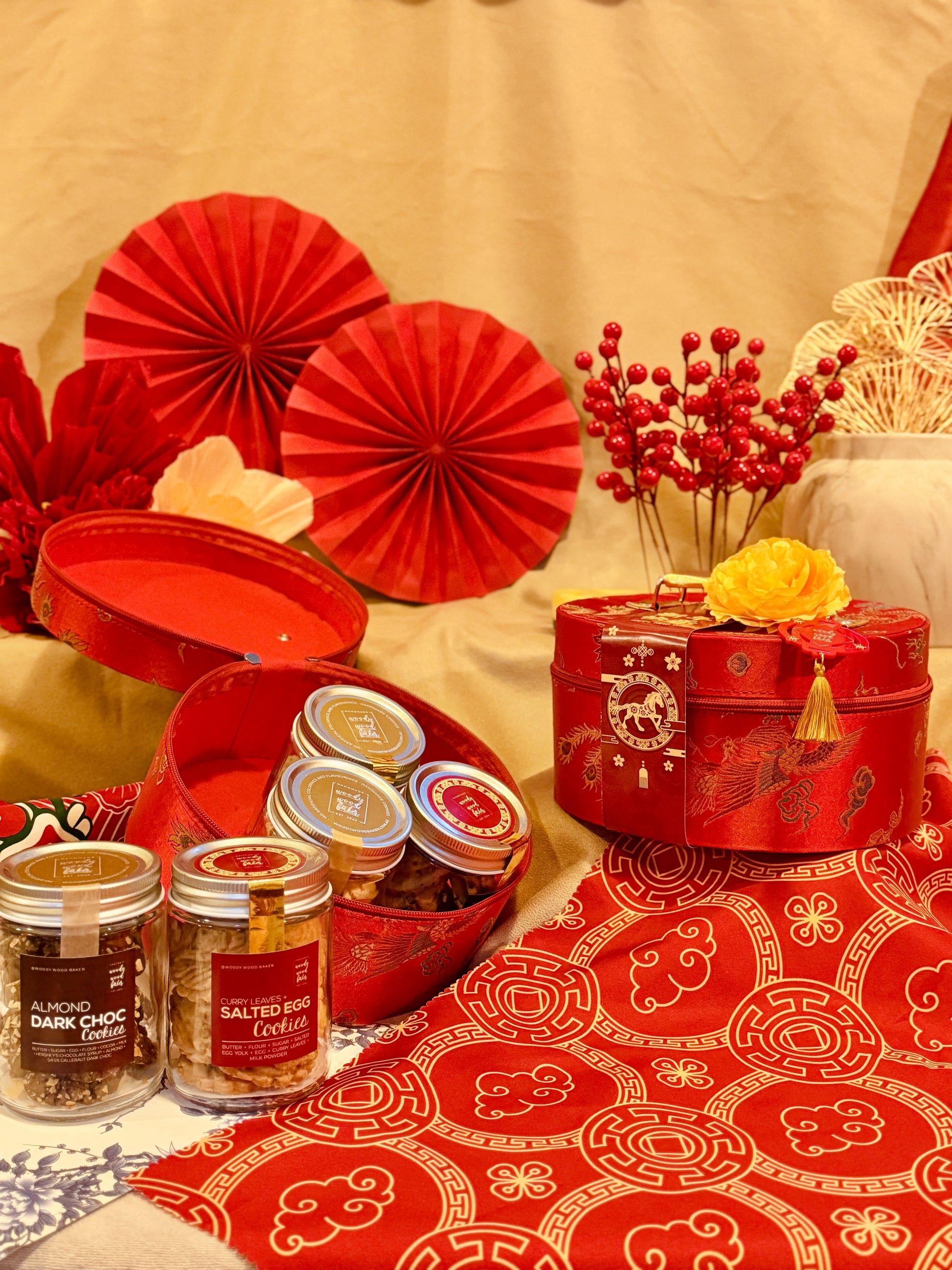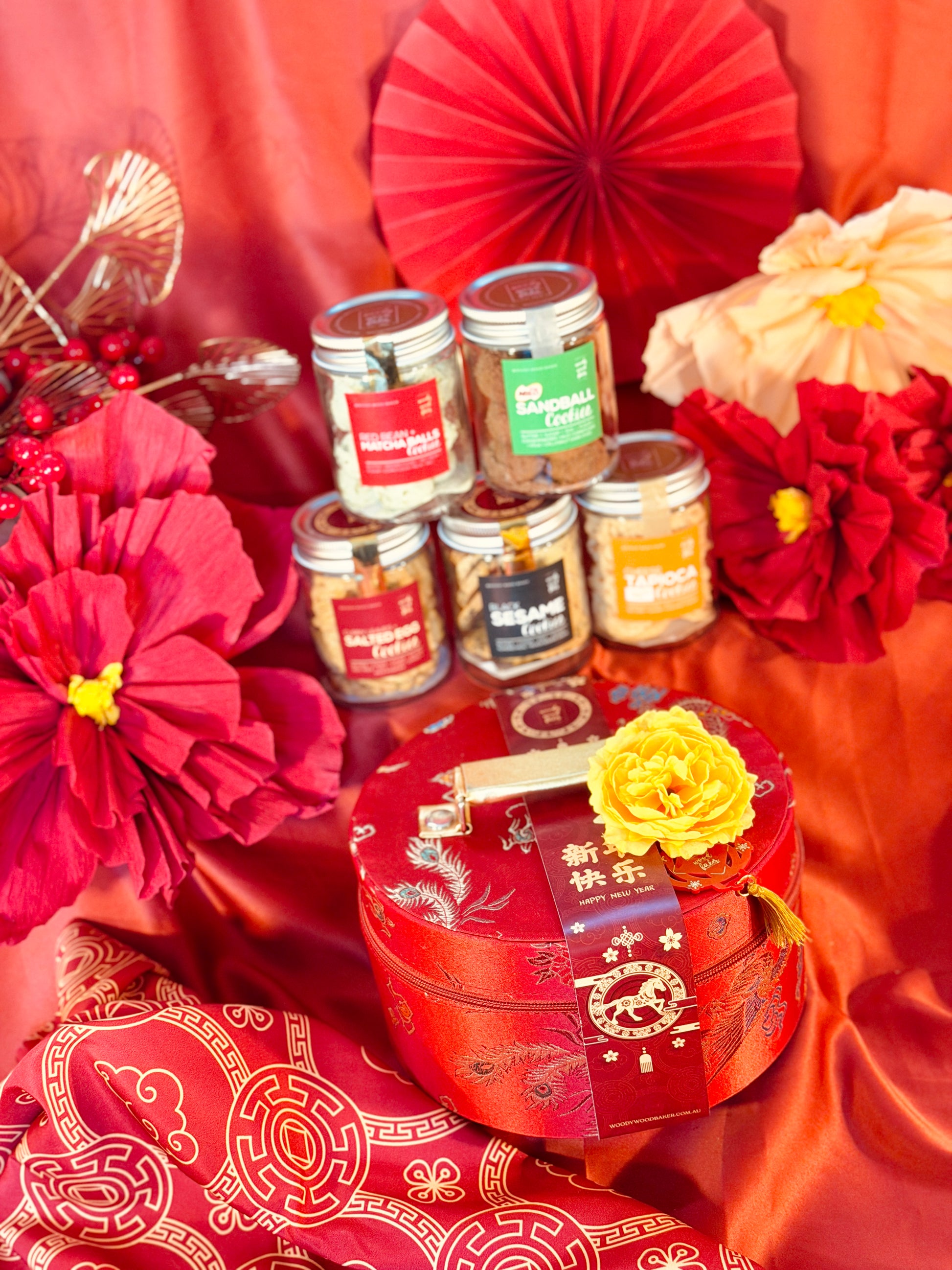 This gift set features five small jars of cookies of your choice, carefully arranged in an elegant round gift box. Handmade in small batches with a rich buttery flavour and delicate crunch, Treasure of Harmony is designed for generous gifting and festive gatherings with family, friends, or corporate celebrations.